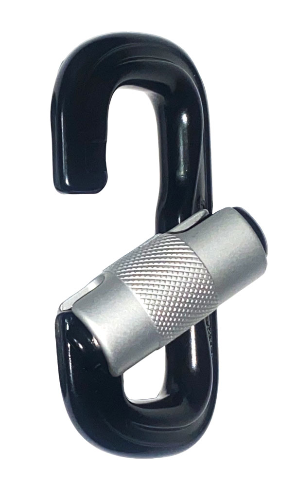 An innovative carabiner from Edelrid for 25mm webbing/risers with twist-lock offset gate for paragliding harness main hang points.