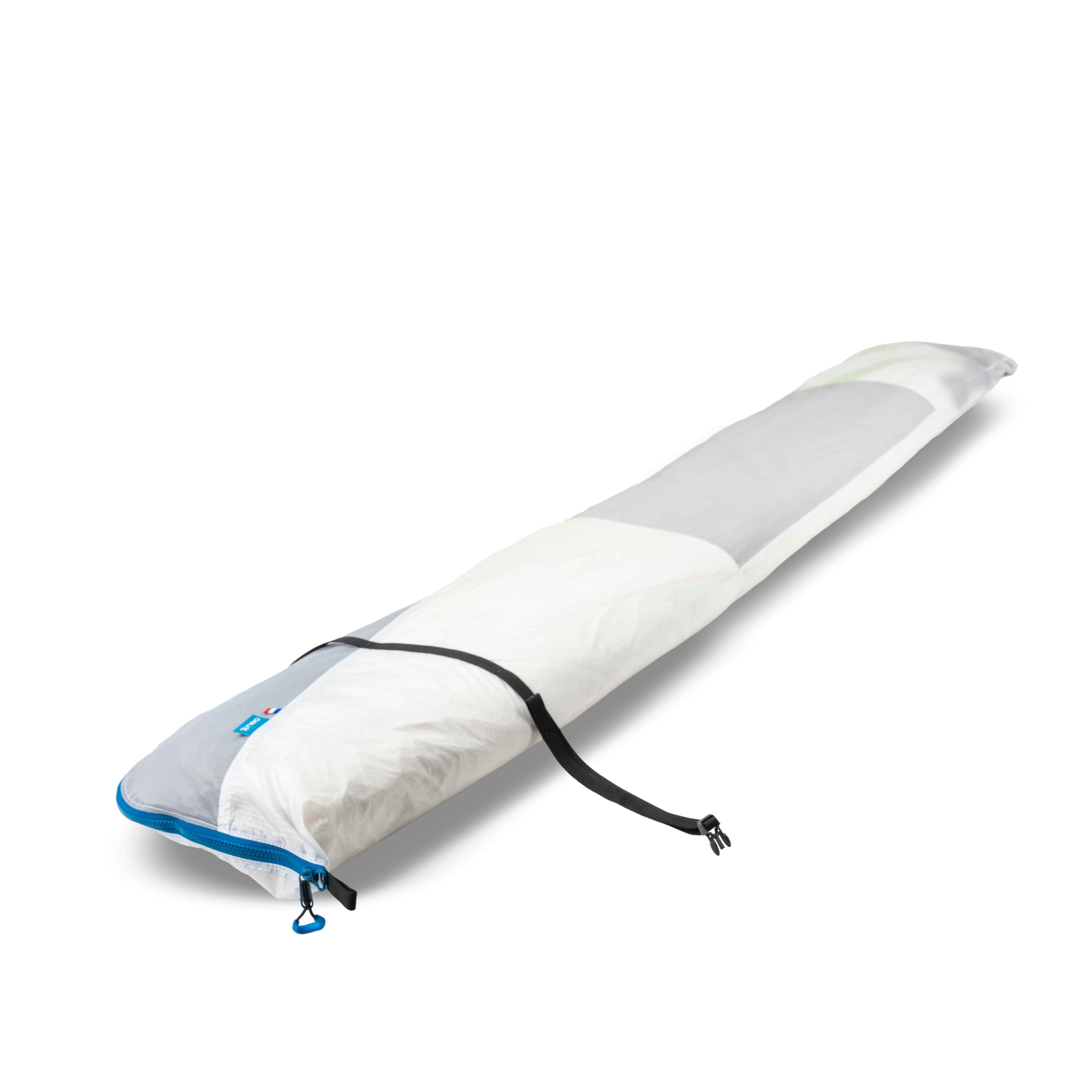 The bag opens at the bottom to allow your wing to stay connected to its harness. Plastic buckles help hold the wing in place when closing the zipper.